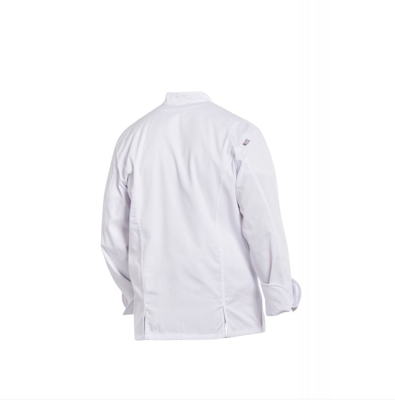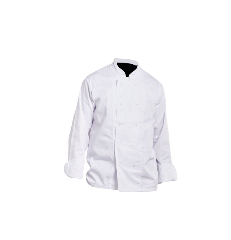 Veste de cuisine de couleur blanche, en coton avec pression et manches longues.