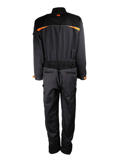 Combinaison de travail deux zips. 65% polyester / 35% coton. 245 g/m².Elastique à la taille.Nombreuses poches fonctionnelles.Fermeture à glissière double zip.Bas des jambes réglable. Liseré rétro-réfléchissant. Coloris gris Anthracite/noir. Contrastes orange.