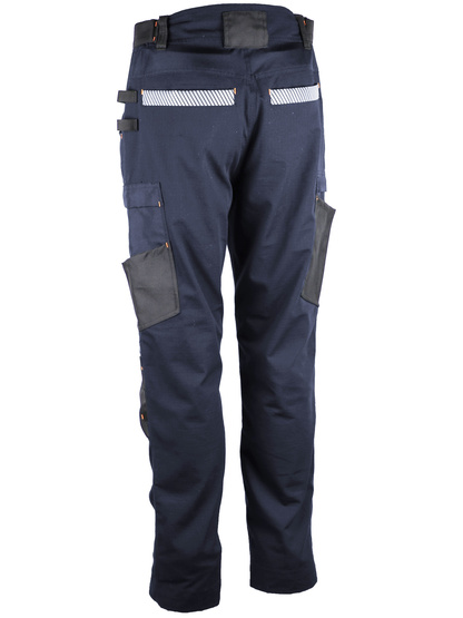 Pantalon de travail ripstop.Matière: 58% coton, 39% polyesteret 3% élasthanne, 280 g/m². 8 poches extérieures.Braguette avec fermeture à glissière et bouton.Passants pour ceinture. Ceinture auto-aggripante.Emplacement renforcé pour genouillères. Taille élastiquée.Possibilité de rallonger la jambe de 5 cm.Bandes rétro-réfl échissantes flexibles segmentées.Coloris: bleu marine et noir.