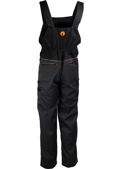 Cotte à bretelles de travail.65% polyester / 35% coton. 245 g/m2. Emplacements pour genouillères. Elastique à la taille.Nombreuses poches fonctionnelles dont deux avec zip..Bretelles ajustables.Coutures renforcées. Liserés rétro-réfléchissants. Coloris gris Anthracite/noir. Contrastes orange vif.